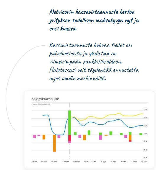 Sähköinen taloushallinto Netvisorilla tarkoittaa tehokkaampaa, läpinäkyvämpää ja ajantasaisempaa yrityksen talouden hallintaa – kaikki yhdessä järjestelmässä. Se on moderni tapa hoitaa taloushallinto niin, että yrityksen johto voi keskittyä kasvuun ja liiketoiminnan kehittämiseen.